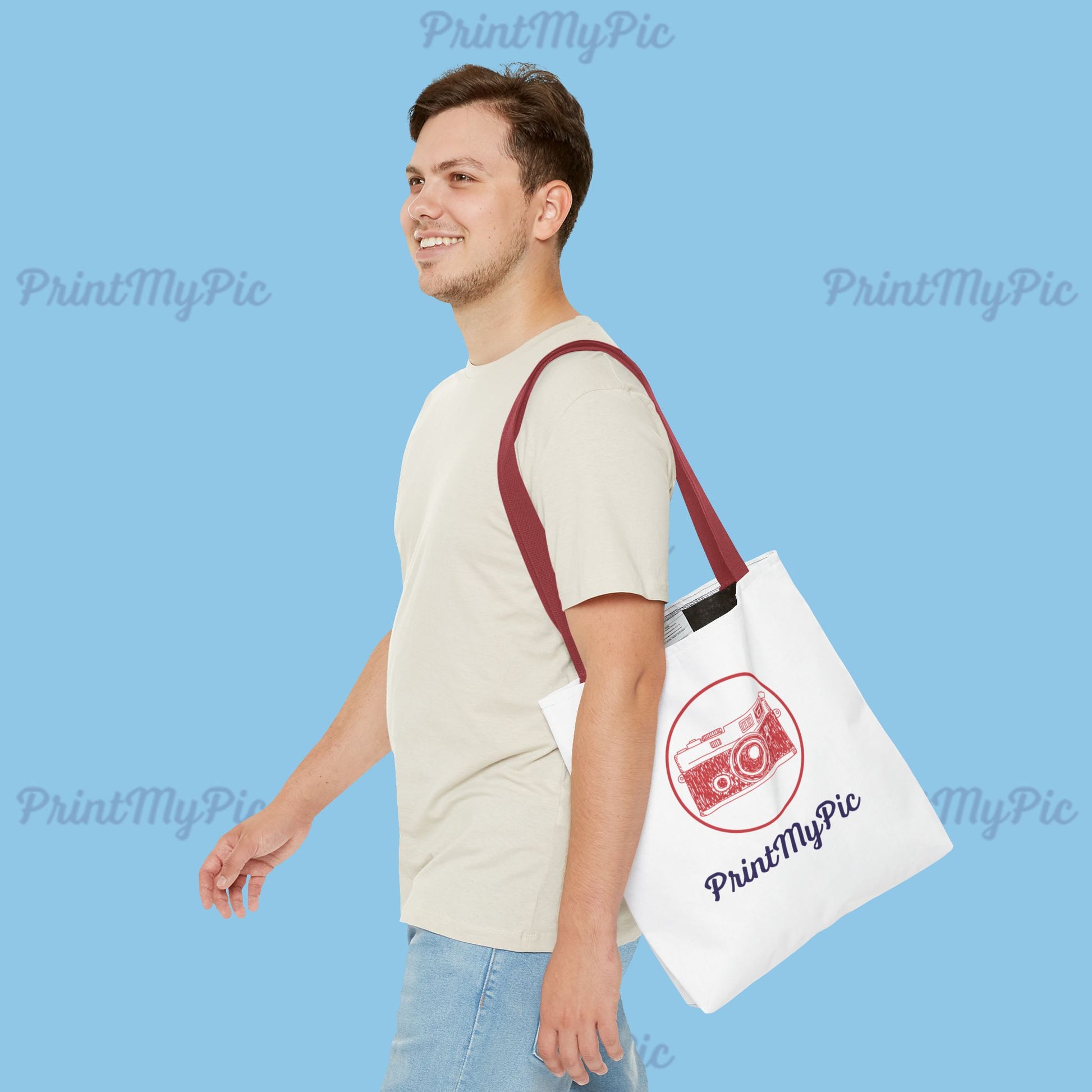 Available in 3 sizes to add both functionality and style, these custom-printed tote bags come with multiple handle colors to match your designs. Made with spun polyester, these bags feature double-stitched seams, cotton webbing straps, and nonwoven laminate lining for high-end durability. Your all-over print is created with dye sublimation for high-end visuals.